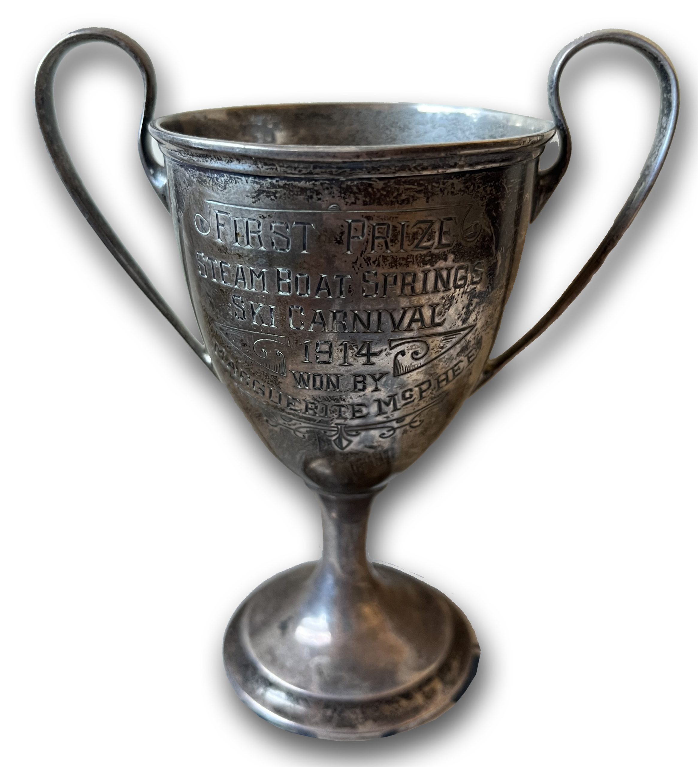 Organized by Carl Howelsen, also known as the “Flying Norseman,” Steamboat Springs’ first Winter Carnival took place on February 12, 1914. Nearly 2,000 local spectators filled the streets and the jumps on Woodchuck Hill (where today’s college is) to witness what was then referred to as the Steamboat Springs Ski Carnival. While train delays limited Denver visitors to just twenty people, the enthusiasm of the community remained undimmed. The program began at 9:00 a.m. with the Steamboat Springs Gun Club gathering on the shooting grounds. Afternoon activities featured a half-mile race for boys using heavy wooden skis with hand-cut leather straps. Prior to Howelsen’s arrival, skiing had been primarily utilitarian; however, he introduced recreational jumping and racing. The carnival was built around ski jumping, cross-country racing, and novelty “street events”. Notable street competitions included skijoring, hurdle races, and ring-and-spear contests. On Woodchuck Hill, Howelsen himself won the professional jumping event with his longest jump of 108 feet. This overwhelming success led to the 1915 founding of the Steamboat Springs Winter Sports Club, established specifically to promote an annual carnival and recreational skiing. By the early 1940s, these traditions led to the town being labeled “Ski Town U.S.A.”. The photo show is a sterling silver ski trophy won by Marguarite McPhee, a Denver socialite and frequent visitor to Steamboat, during the very first Winter Carnival in 1914. Sadly, McPhee would die of the Spanish Flu just 4 years later.