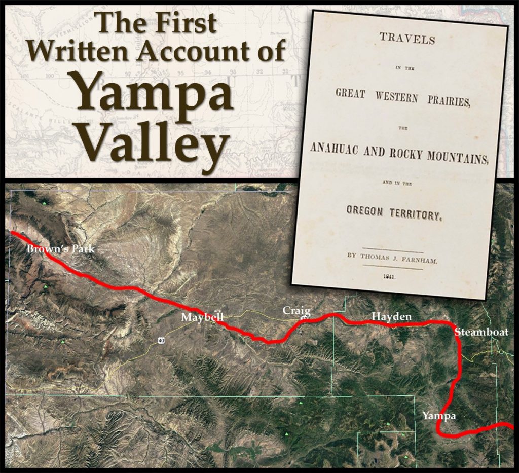 The first written account of the Yampa Valley in 1839 is a stark reminder of the hardships faced by those venturing beyond civilization. Thomas Jefferson Farnham left Illinois with 19 men bound for Oregon but chose a southern route through Colorado. Near mutiny reduced his party to a few men and a loyal dog. On July 31, they reached Egeria Park near present-day Yampa, describing Finger Rock and the valley’s beauty. By August 4, they were in Steamboat Springs, exploring Sulphur Cave and its hot springs. Scarcity soon forced them to kill and eat their dog near Maybell. Farnham lamented the barren land until relief came on August 13 at Fort Davy Crockett in Brown’s Park. His 1841 book Travels in the Great Western Prairies recorded both suffering and the earliest published description of the Yampa Valley.